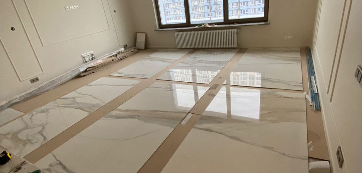 Приступаем к работам с керамогранитом, не забываем про правильную раскладку, запил углов под 45*, сохранение ровных швов по периметру. Работы по керамограниту приняты – акт подписан, заказчик в восторге.